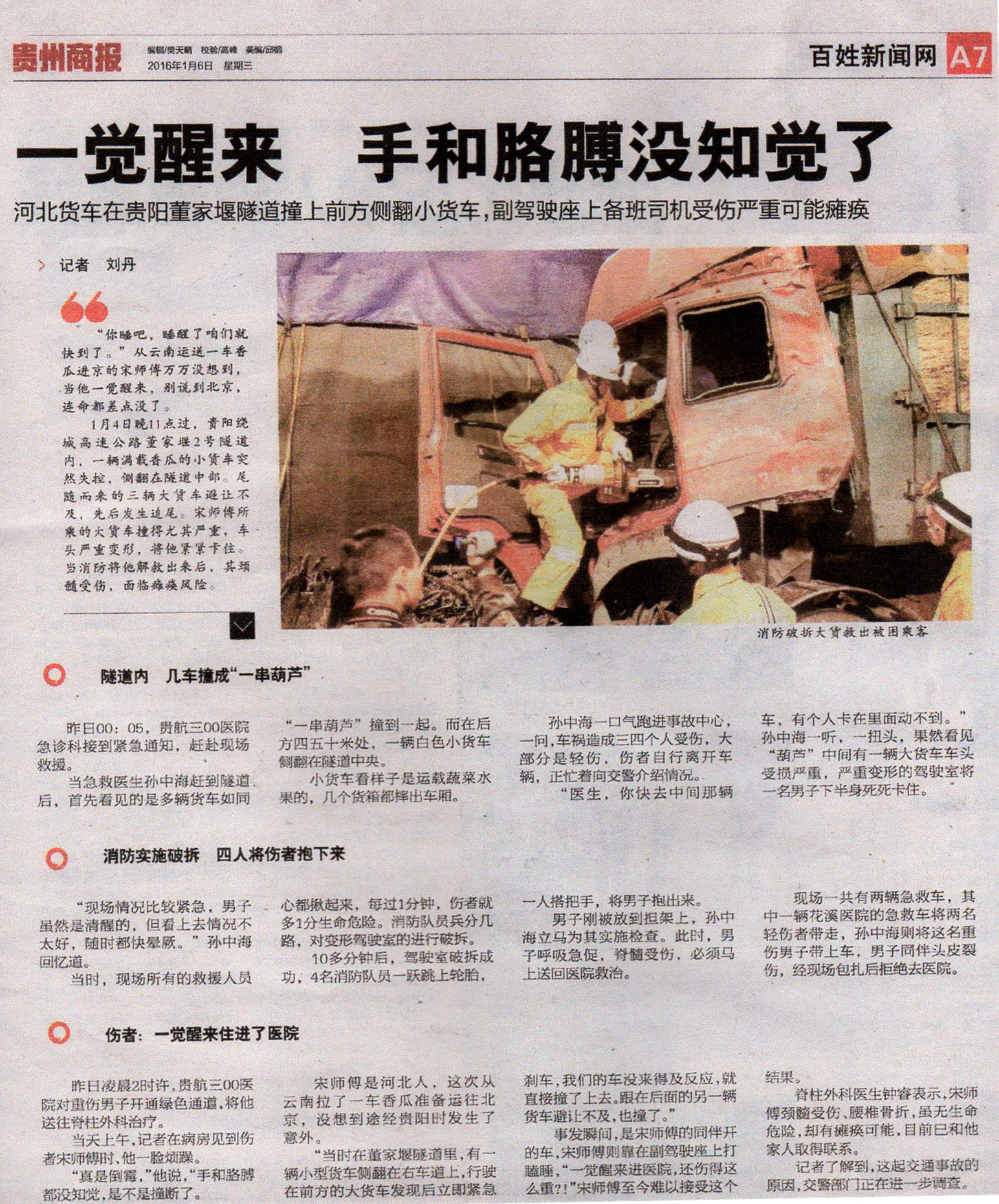 1月6日《贵州都市报》:前方小货车侧翻 后面三货车相撞