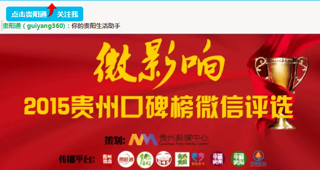 聚焦微信影响,彰显口碑力量。2016年1月,贵州新媒中心发起了“微影响—2015贵州口碑榜”系列评选活动,通过旗下贵阳通、贵州热点等系列微信公众平台,面向百万粉丝对贵州民生相关的21个行业的满意度、美誉度展开调查,最终票选出各行业口碑排行榜前十名。