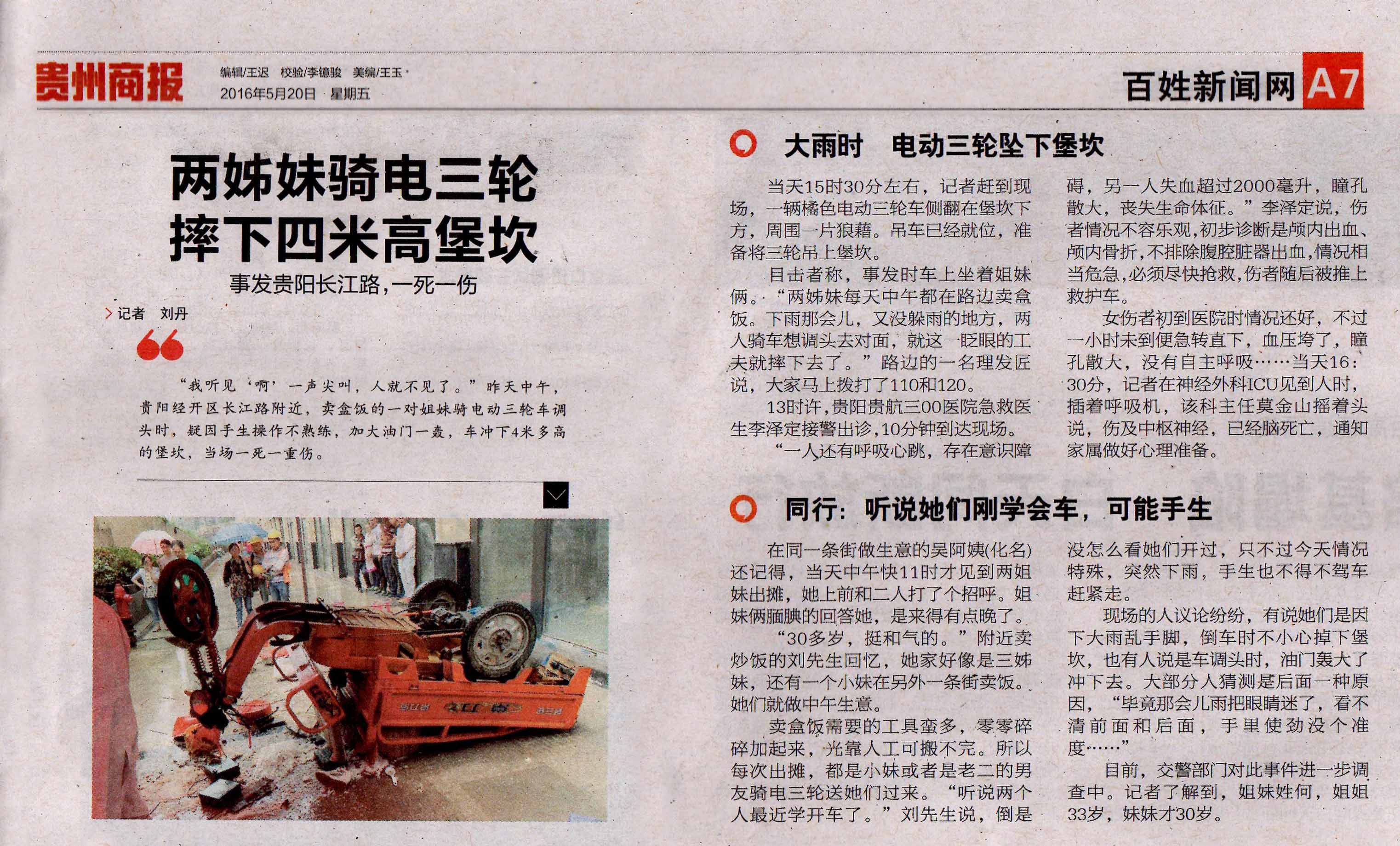 5月20日《贵州都市报》报道:两姊妹骑电三轮摔下四米高堡坎