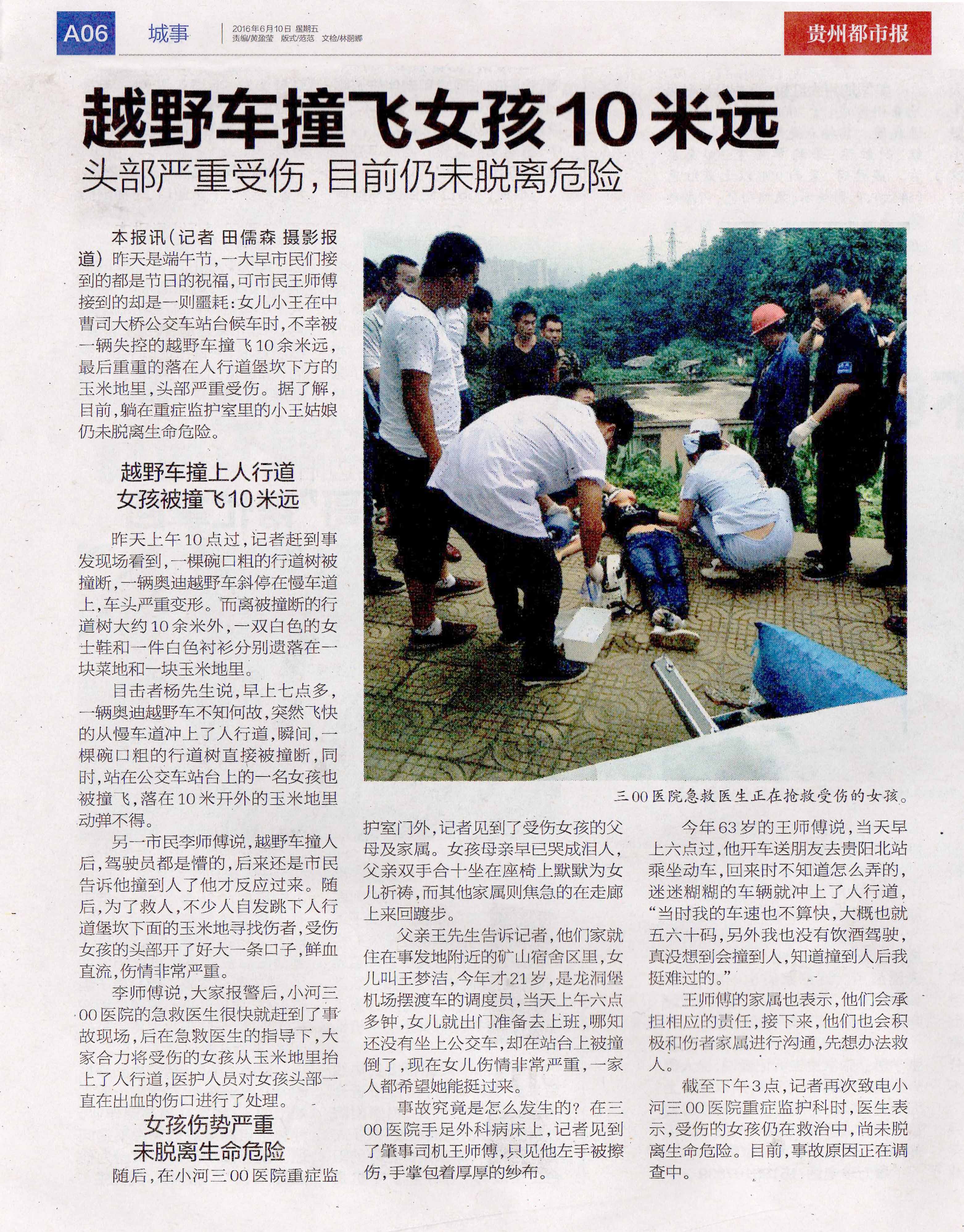 6月10日《贵州都市报》报道:越野车撞飞女孩十米