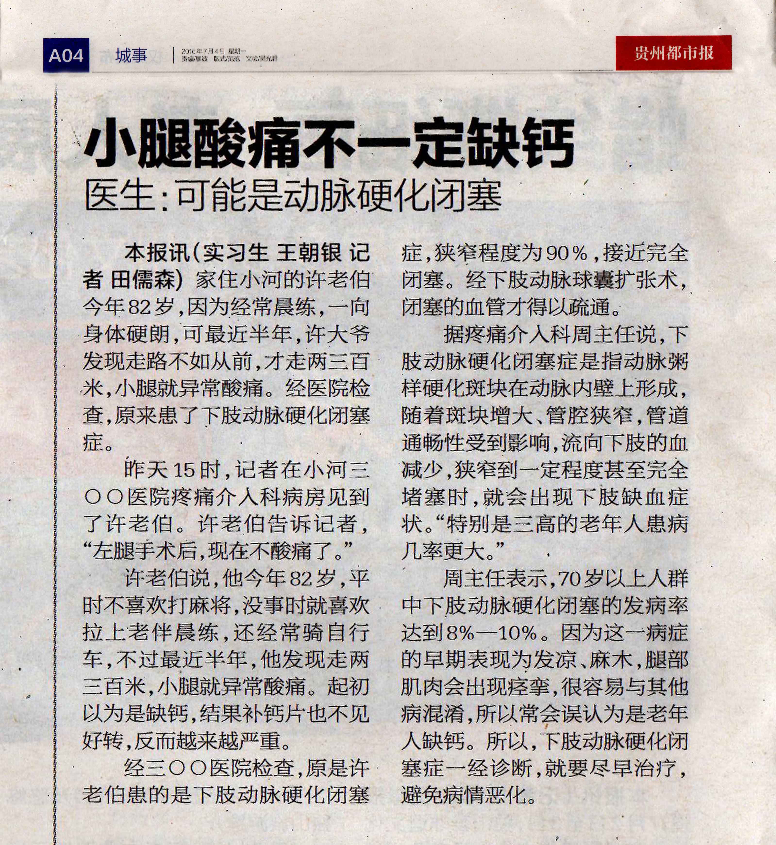 7月4日《贵州都市报》报道:小腿酸疼不一定是缺钙