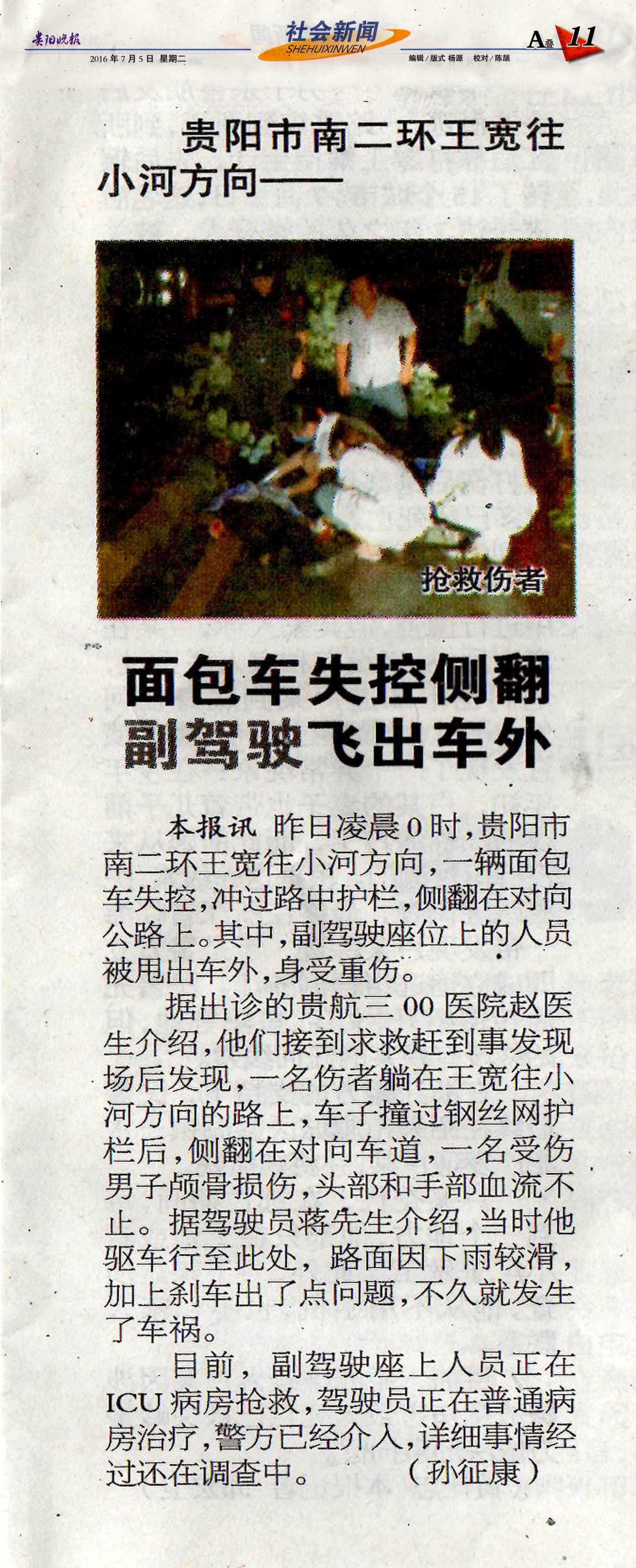 7月5日《贵阳晚报》报道:面包车失控侧翻副驾驶飞出车外
