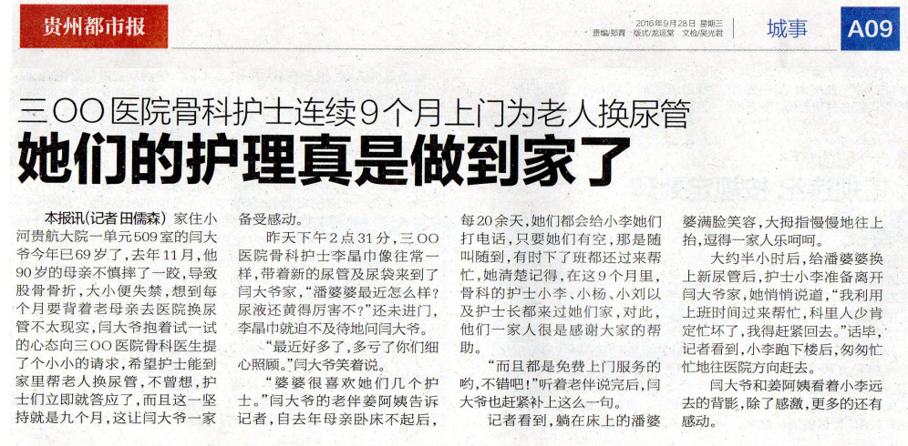 9月20日《贵州都市报》报道:她们的护理真是做到家了