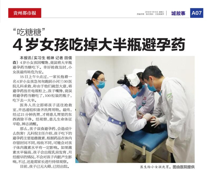 2018年1月16日《贵州都市报》报道:4岁女孩吃掉大半瓶避孕药