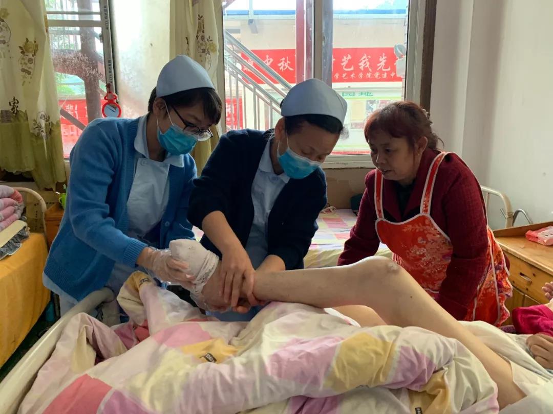 伤口组首先看望长期卧床的高龄患者,到床边对压力性损伤进行会诊,亲自换药,并向护工阿姨进行了换药知识宣教。血糖组向患者及护工耐心地讲解了糖尿病注意事项,为老年人免费监测血糖,提供专业指导。康复组在看望偏瘫患者后,为患者进行了正确的良肢体位摆放,讲解良肢位摆放对患者的好处,并手把手指导护工如何摆放良肢位。