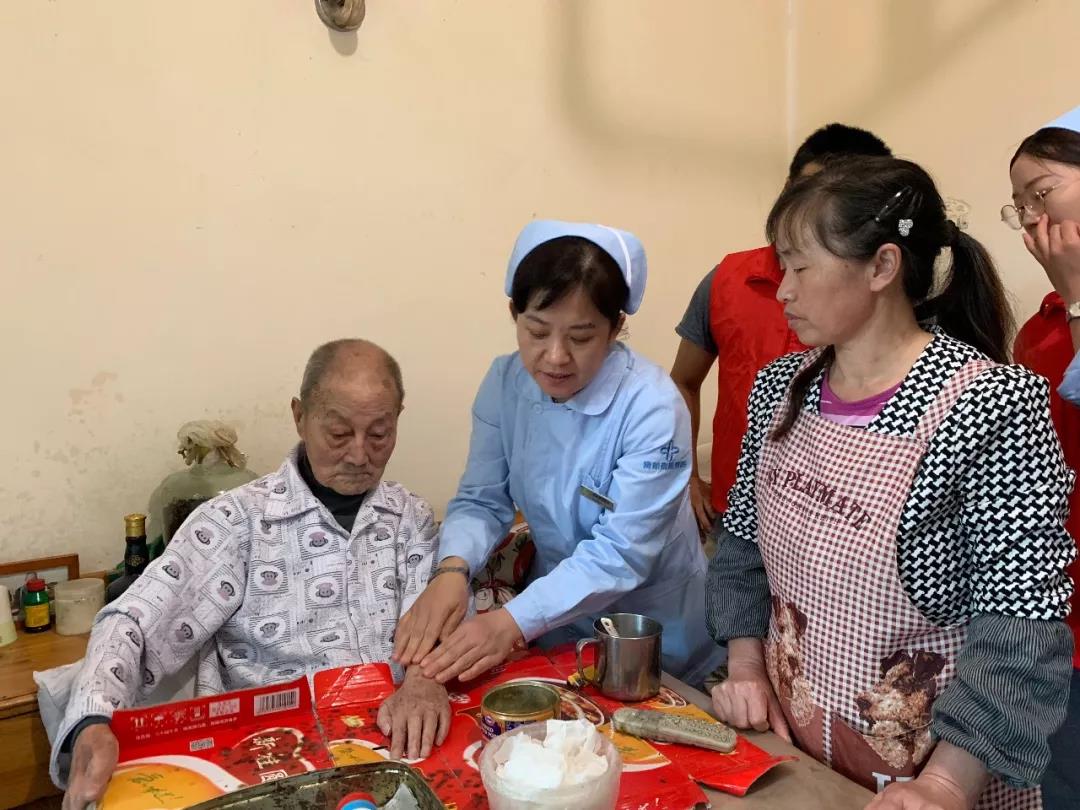 5月28日下午,我院护理部联合团委组织17名志愿者共同来到花溪区亲情养老公寓,看望老年患者。近日阴雨绵绵,但丝毫阻挡不了南丁格尔志愿者们上门服务的热情,来到养老院后,护理小组在了解养老院老人的基本情况后,有针对性的给予了伤口换药、血糖监测及康复指导。