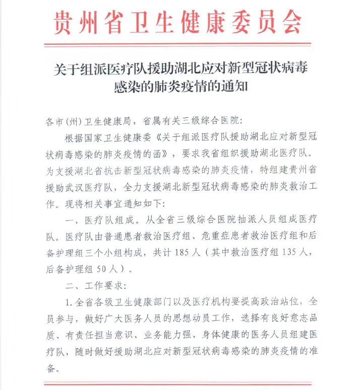 1月26日下午,接贵州省卫健委通知,要求我院组派9名专业医疗护理队伍援助湖北应对新型冠状病毒感染的肺炎疫情。医院党委立刻召开专题会议,并在医院相应微信群开展倡议,仅两个小时不到,就收到主动请战30余人经过遴选。现已完成组派任务,他们是钟俊、杨珂, 隋颖,苟春林,周品姣, 杨玲花, 曹梦瑶, 杜林蔚,韩贵兰。