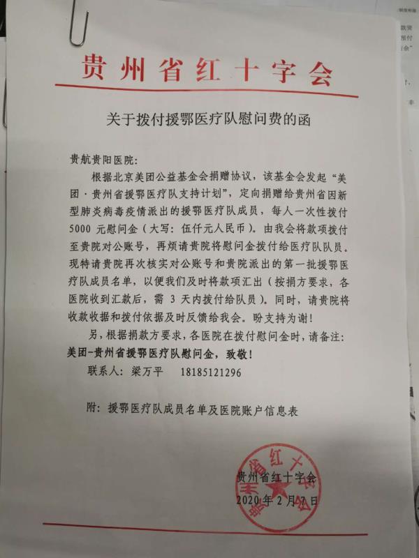 为做好对奋战在湖北防控新冠病毒感染的肺炎疫情的援鄂医疗队员关怀慰问工作,2月7日,贵州省红十字会根据北京美团公益基金会捐赠协议,定向捐赠给贵州省因新型肺炎病毒疫情派出的援鄂医疗队成员,每人一次性拨付“美团-贵州省援鄂医疗队”慰问金5000元,我院共收到慰问金3.5万元。