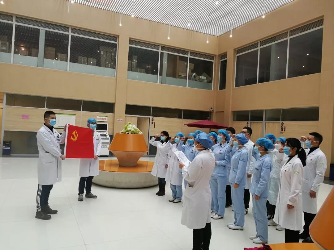 发热门诊临时党支部就是在这样的特殊时期组成的临时先锋队。党支部书记刘柳讲到,今天重温入党誓词,就是要更加牢记全心全意为人民服务的宗旨,牢记我们入党时许下的庄严承诺,更好的为患者服务,更好的完成医院党委赋予我们的光荣使命。现在我们集合在同一面党旗下,在医院党委的领导下,以大无畏的气概投入到这场战斗中,我们有信心一定会打赢这场抗疫阻击战,无愧于共产党员这一光荣的称号。