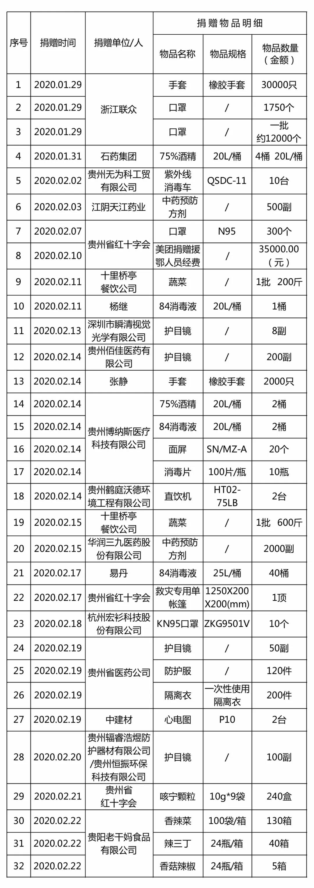 贵航贵阳医院新冠肺炎疫情防控社会捐赠明细清单公示(第一批 截止2020.02.23)