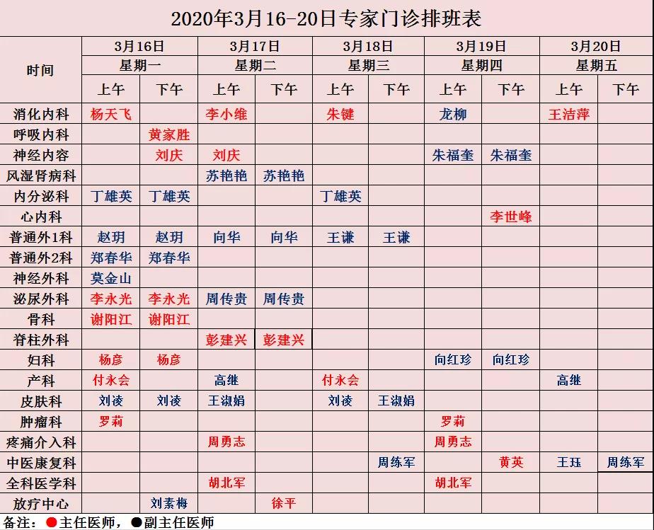 按相关要求,为方便患者就医,我院恢复正常门诊,3月16日-20日专家门诊安排如下: