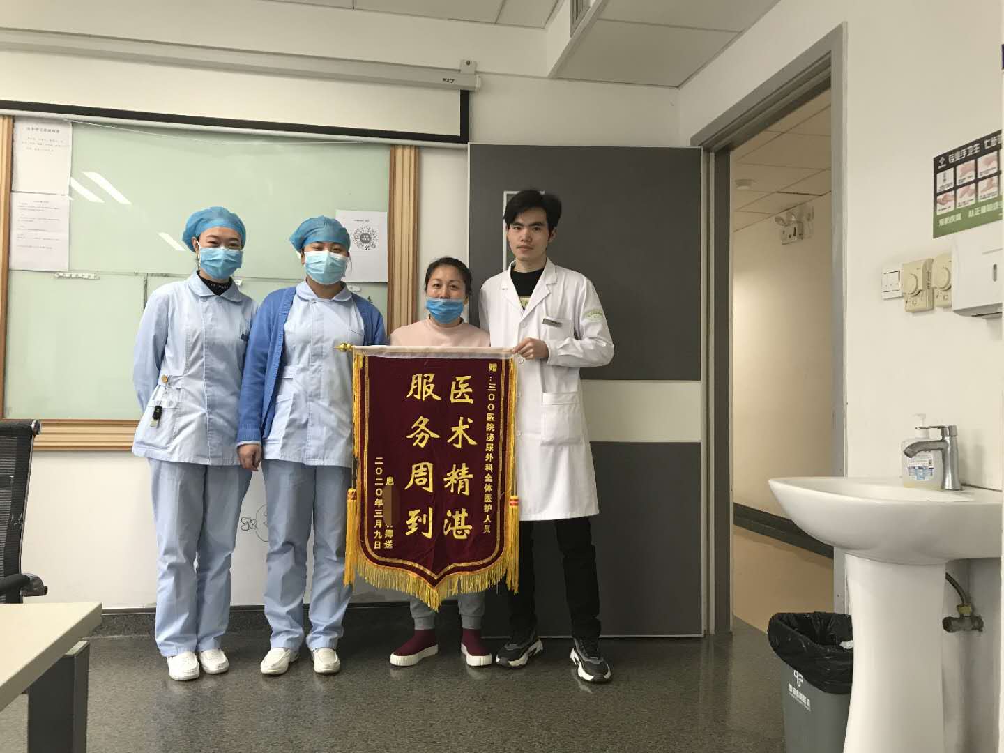 3月9日,小卿出院,小卿的母亲将一面写着“医术精湛、服务周到”的锦旗交给泌尿外科,感谢泌尿外科全体医护对小卿全心全意的治疗和照顾。