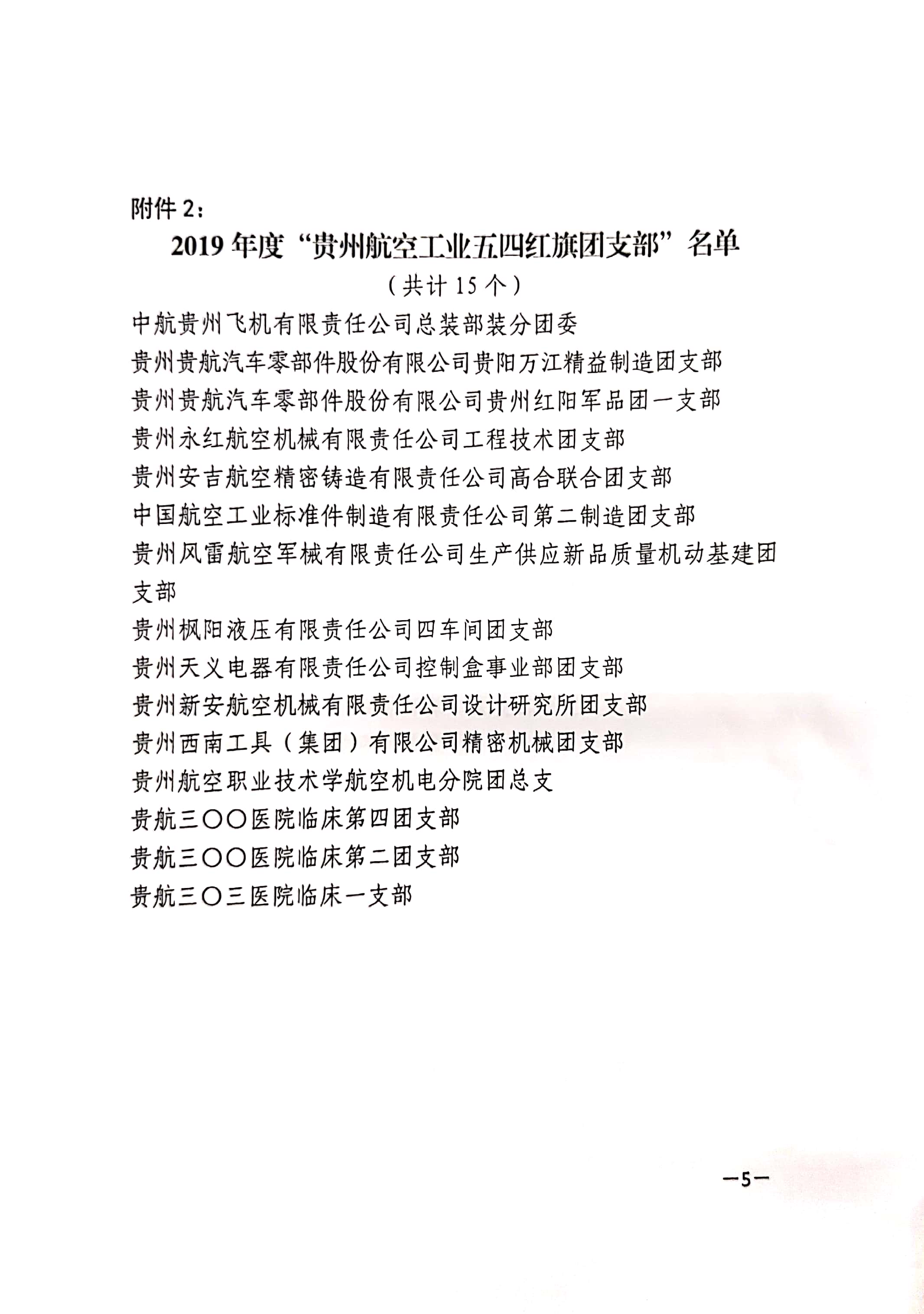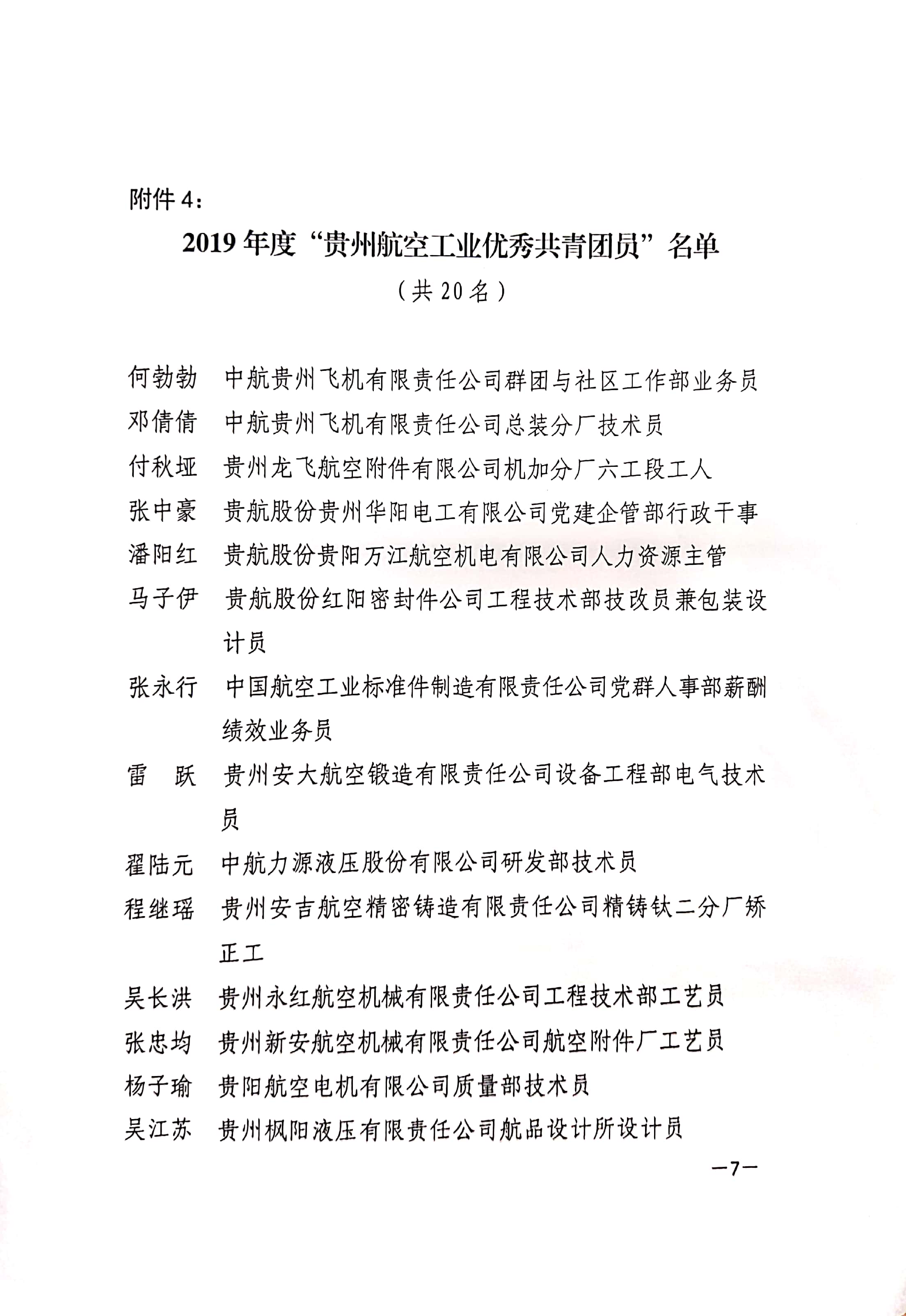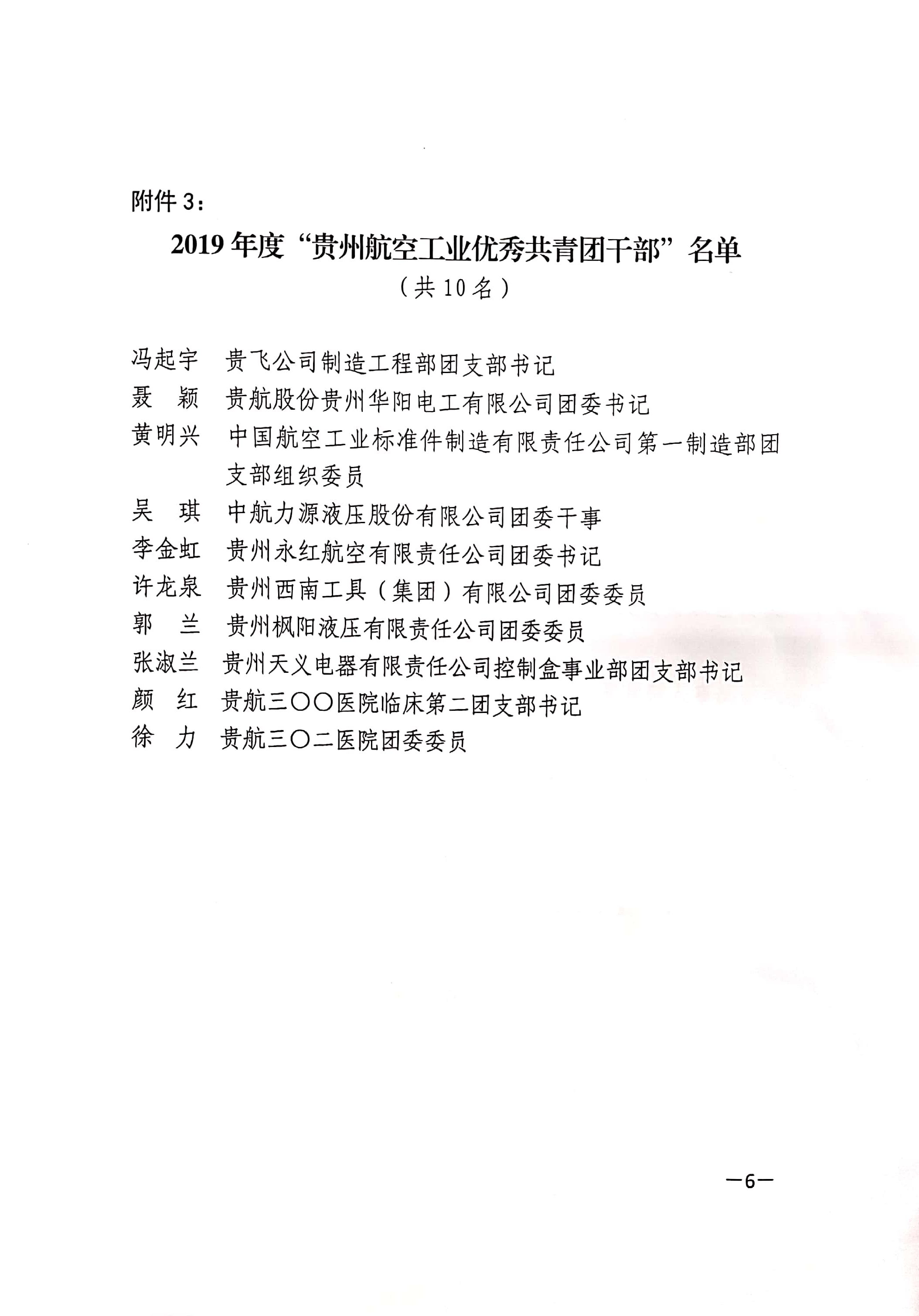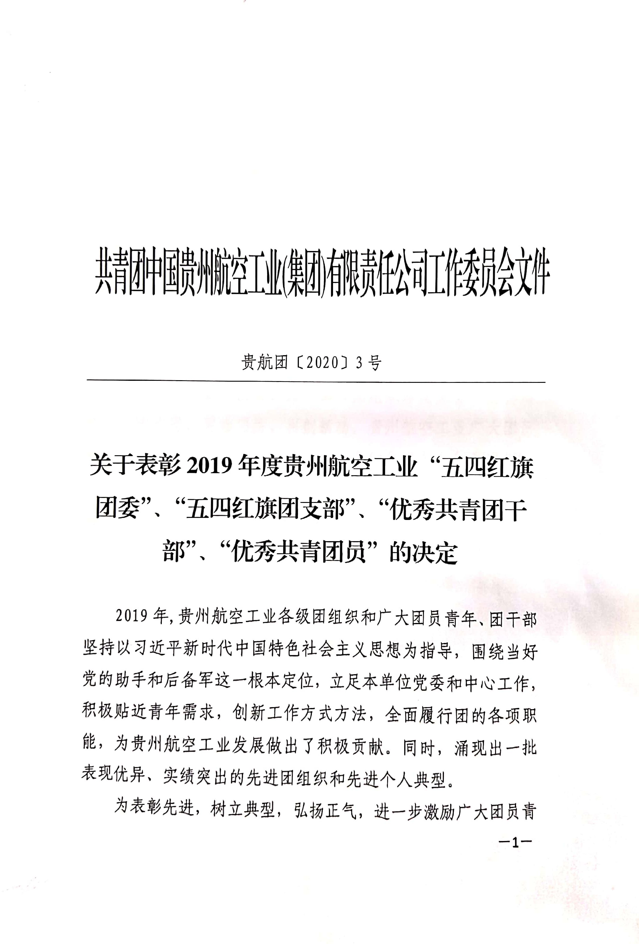 为表彰先进,树立典型,弘扬正气,进一步激励广大团员青年、团干部和基层团组织更加奋发进取,开拓创新,在实现企业改革发展中贡献青春力量,共青团贵航集团公司工作委员会决定授予中航贵州飞机有限责任公司团委等10家团委为2019年度“贵州航空工业五四红旗团委”,授予贵州贵航汽车零部件股份有限公司贵阳万江精益制造团支部等15个团(总)支部为2019年度“贵州航空工业五四红旗团支部”,授予李金虹等10名团干部为2019年度“贵州航空工业优秀共青团干部”,授予毕琴等20名团员为2019年度“贵州航空工业优秀共青团员”。