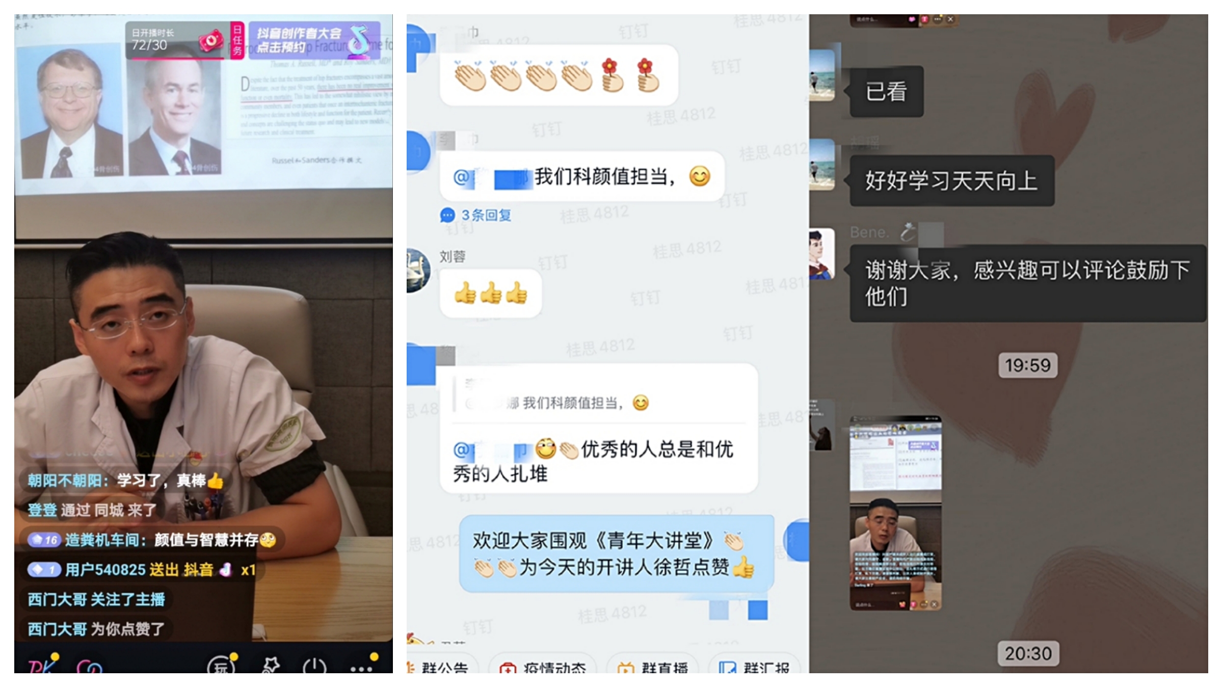 本期“青年大讲堂”由2019年度青年岗位能手、骨一科医生徐哲带来《老年髋部骨折的流行病学与诊疗规范》的精彩分享拉开青年学习成长营的帷幕,徐哲从老年髋部骨折的危害与诊疗现状、老年髋部骨折的诊疗历史、救治的时效性对老年髋部骨折的诊疗意义、我院率先在省内开展老年髋部骨折诊疗绿色通道等四大方面展开了交流。本次线上直播共获得了300余名青年团员和广大职工的在线关注,抖音和钉钉平台的点赞数超过1000余个,大家纷纷通过互联网平台积极点赞、热情评论,“优秀的人总是和优秀的人扎堆”、“跟着团团好好学习”、“能一起学习真好”………在许许多多的评论中我们能看到医院青年那善于学习、乐于成长的心,希望通过“青年大讲堂”活动,吹响青春集结号,以优秀青年的向上力量感染和带动更多青年人的参与其中,立足岗位做贡献,积蓄力量促成长。