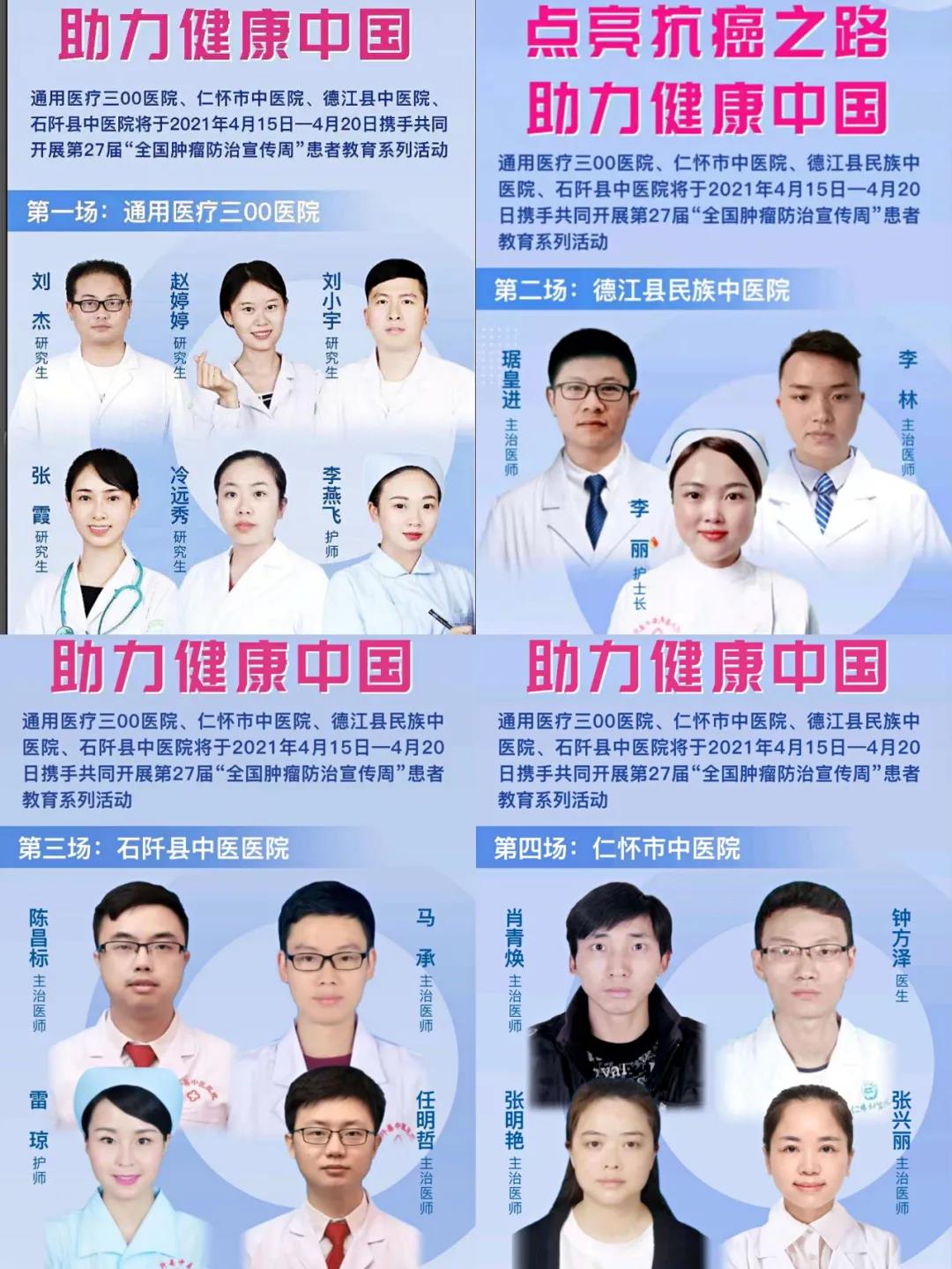 近期,我院肿瘤科邀请仁怀市中医院肿瘤科、德江县民族中医院肿瘤科及石阡县中医院肿瘤科联合举办了“肿瘤防治宣传周”活动。四家医院17名医护人员通过线上授课的方式宣传抗癌、防癌的科普知识,主要围绕常见肿瘤,如:肺癌、肠癌、肝癌、胃癌、乳腺癌的预防与早筛,肿瘤患者营养指导,慢性癌痛的居家管理,终末期患者家庭心理指导等内容进行详细具体的阐述,并在线上对患者关心的各种问题进行解答。深受患者及家属的认可和好评。活动有效地宣传了癌症对人民群众生命健康安全的危害以及相关的防癌、抗癌知识,使更多的人了解保持健康生活习惯的重要性,有力提高人民群众的卫生保健意识,获得了一定的社会效益。