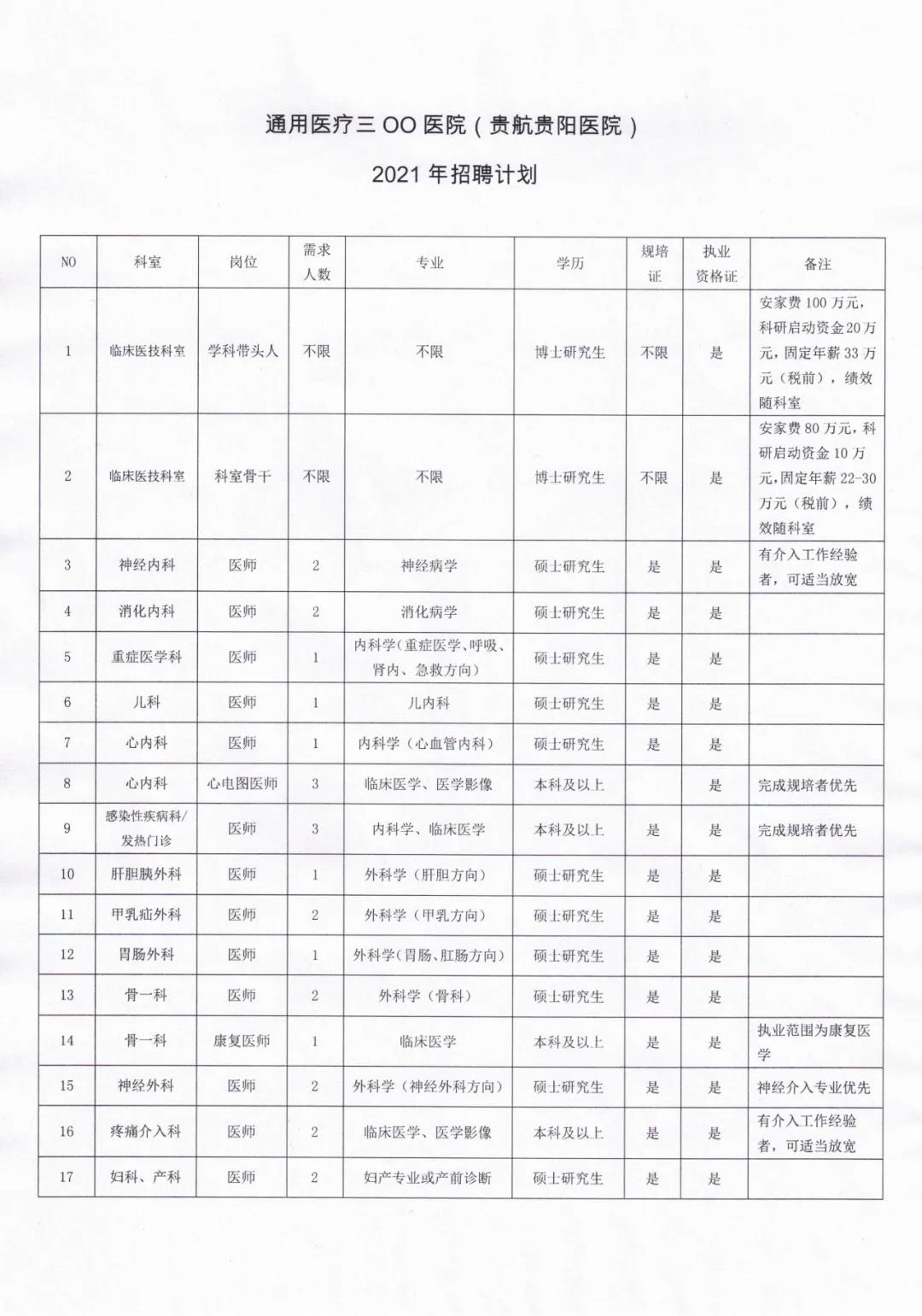 通用医疗三OO医院(贵航贵阳医院)2021年招聘简章