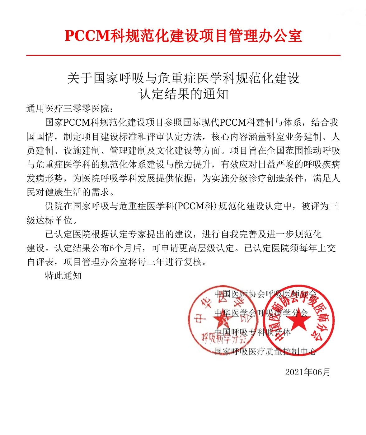 我院呼吸与危重医学科荣获PCCM规范化建设三级医院达标单位