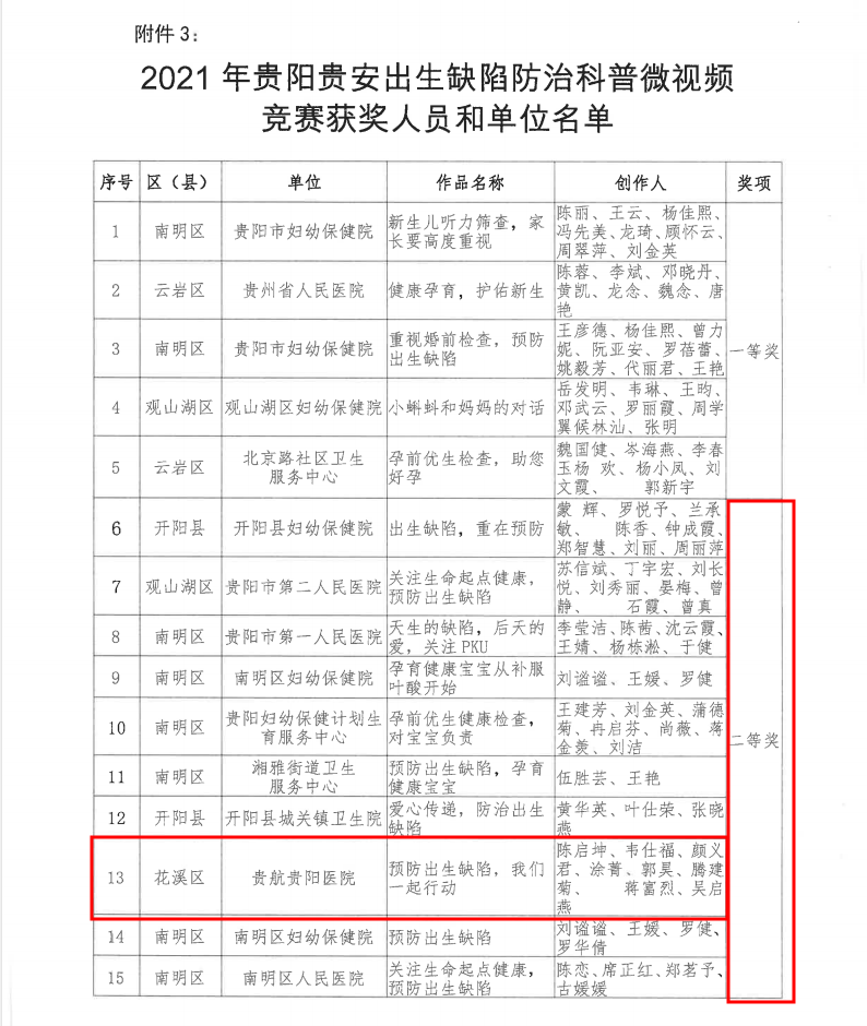 近日,根据贵阳市卫生健康局、贵阳市总工会文件筑卫健发〔2021〕3号文件通知,我院陈启坤、韦仕福等人组成的科普团队在2021年贵阳贵安出生缺陷防治科普竞赛中,以优异的成绩获得二等奖。