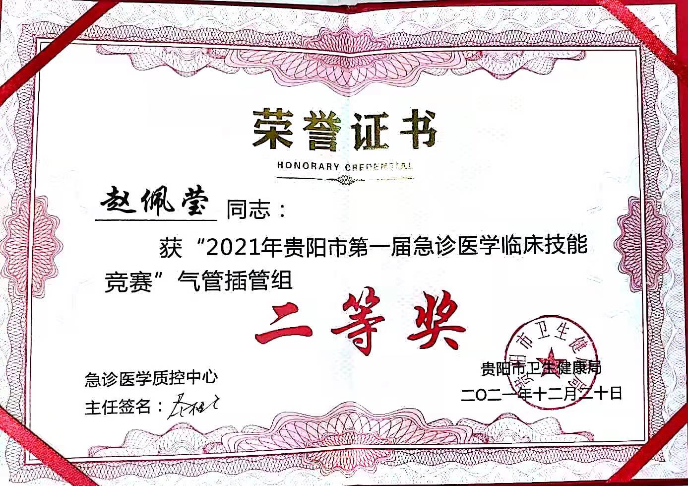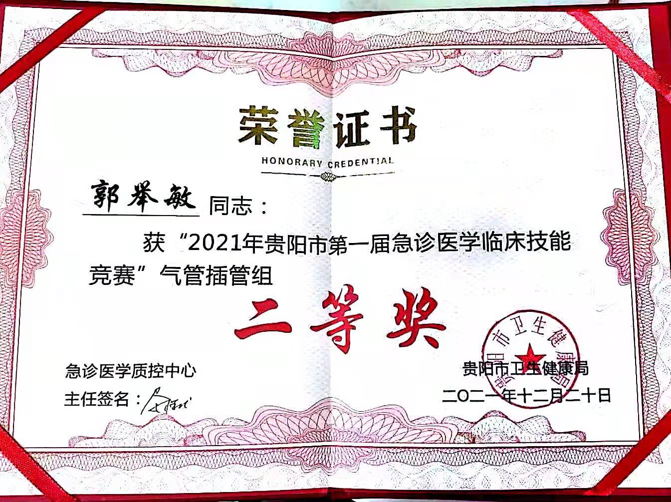 经过比赛激烈的角逐,我院重症医学科副主任赵佩莹、护士长郭举敏荣获“2021年贵阳市第一届急诊医学临床技能竞赛”气管插管组二等奖。