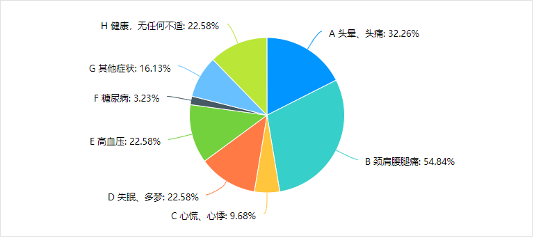 本次活动联合贵州西南工具(集团)有限公司开展,为保护职工隐私,问卷只涉及性别、年龄、岗位性质、是否规矩体检、是否有异常指标等项目,同时调研近期是否存在心脑血管、神经系统、肩颈腰腿疼痛及骨科系统等常见症状,再征询在即将进行的义诊活动对疾病防治、健康科普、预防保健、中医中药、用药咨询等方面的意向,通过以上项目,基本对企业职工的健康状况及咨询意向有了初步了解。