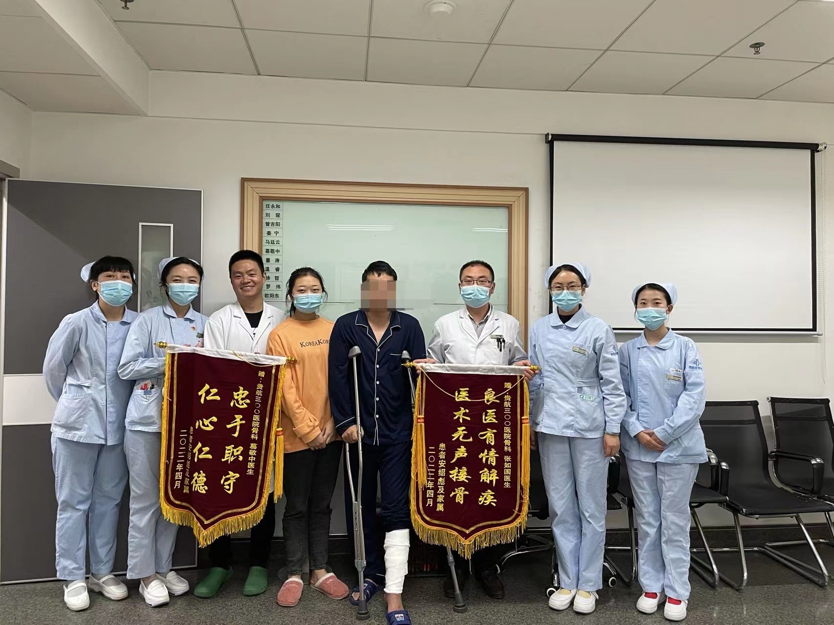 3月28日,27岁的安先生因外伤致左侧胫骨骨折来我院治疗,在完善相关检查后,科室主任医师张如国和管床医生葛敬中精心制定了手术方案,术后张如国、葛敬中每日查房检查患者伤口,耐心地演示并指导患者及家属进行功能锻炼,患者恢复良好。患者及家属对治疗效果和服务态度都非常满意,出院前特送来两面锦旗,表达对骨科病区精湛的技术和暖心服务的感谢及认可。
