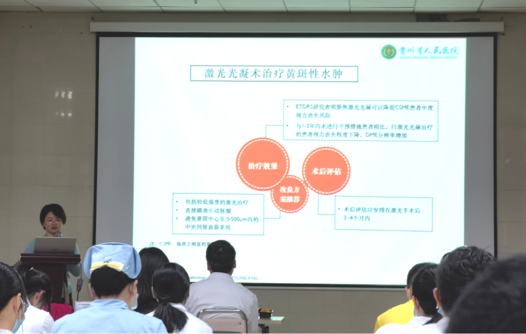 贵州省人民医院眼科朱晓燕教授为我院参会职工带来题为《全身疾病相关视网膜病变的诊治》的讲座,朱晓燕教授表示,随着全国老龄化的不断增加,患眼部视网膜病变的患病率也逐渐升高,而往往这些患者都伴随着全身性疾病,如高血压、糖尿病、高血脂等,所以更加倡导现在多学科合作的诊疗模式。