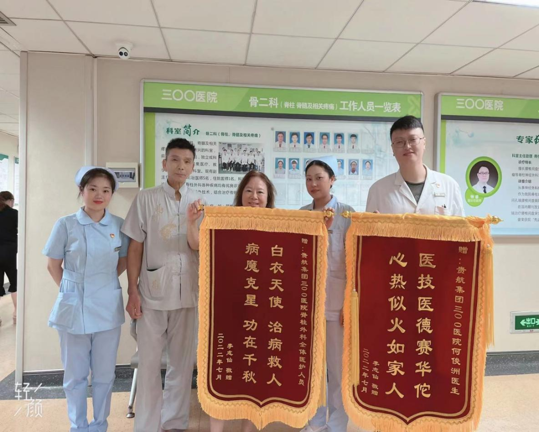 2022年7月11日脊柱外科收到来自李阿姨一家送来的“医技医德赛华佗,心热似火入家人”“白衣天使 治病救人,病魔克星 功在千秋”的二面锦旗,以表对我们的感激之情及对我们的认可。
