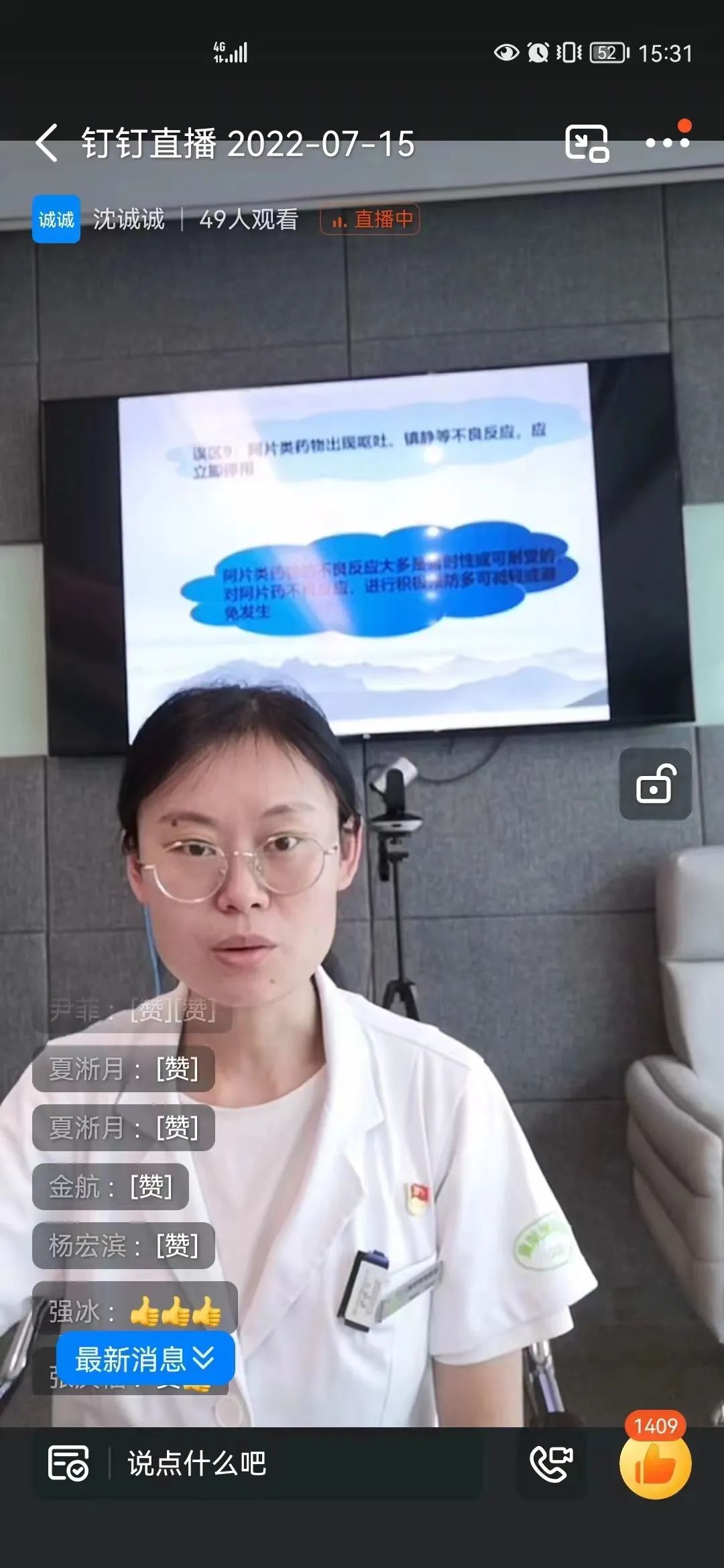 赵婷婷就癌痛的概念、评分标准、治疗原则进行了讲解,提供了止痛药物副反应的防治小妙招,同时就老百姓对于止痛药的常见误区进行了一一解释。鼓励正在遭受癌痛的患者积极直面疼痛,正确认识癌痛。还通过提问的方式与在线观众进行了很好的互动交流,观众们纷纷围观热情回应。