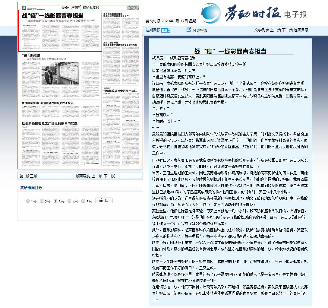 2020年3月17日《劳动时报》报纸报道:战“疫”一线彰显青春担当