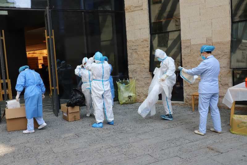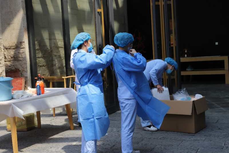 据了解,本次核酸检测地点设置在贵州援鄂医疗队返黔定点隔离酒店,接受检测的返黔队员相互保持距离,排队进行核酸检测。核酸检测时医护人员要直接和检查人员的呼吸接触,所以必须做好全方位的防护。穿隔离衣、防护服、防护口罩、护目镜、面屏、医用乳胶手套、防水靴套,每个步骤都不能有错。