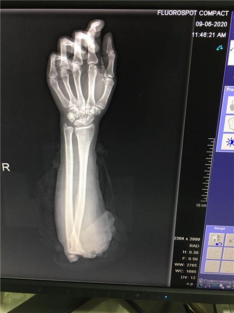 经诊查,该病人存在右肘部完全性离断伤,伤情严重,情况危急,随时可能有生命危险。骨一科立即组织人员抢救,成立以科主任田广为首的抢救小组,针对病人伤情严重,断肢再植后不能存活的可能,抢救小组认真制定救治方案。