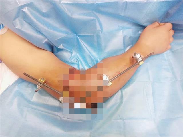 田广表示,张女士来院时断臂右肘关节完全离断,因大肢体的肌肉组织多,若超过6至8小时没能通过手术接上,便会出现不可逆的坏死。