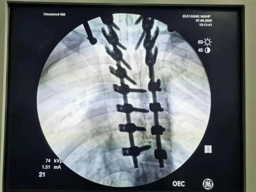 8月7日,在手术麻科医护人员的全力配合下,医生为张某做了经后路脊柱松解矫形,椎弓根螺钉内固定术。术中,医生对患者的四肢神经进行全程检测,最终历时7个小时成功完成手术。