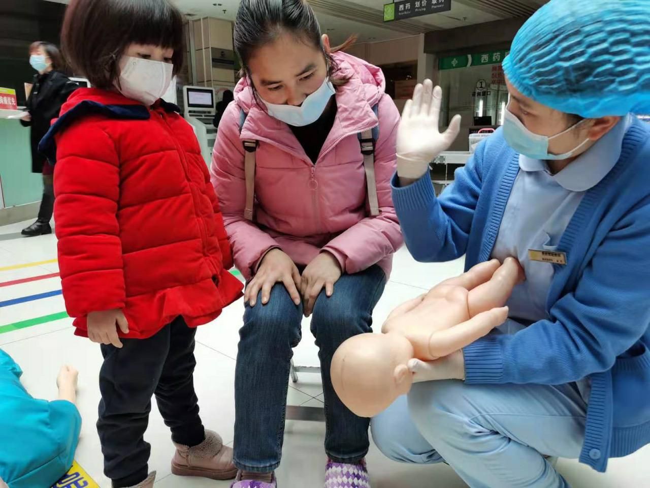 随后,现场的医护人员还给大家示范了呼吸道异物梗阻的“海姆立克急救法”,包括成人、孕妇及婴儿的急救,都一一做了演示。示范结束后,还向大家讲解了平时如何进行预防,避免异物梗阻的发生,如果遇到困难,应该如何处理等小知识。