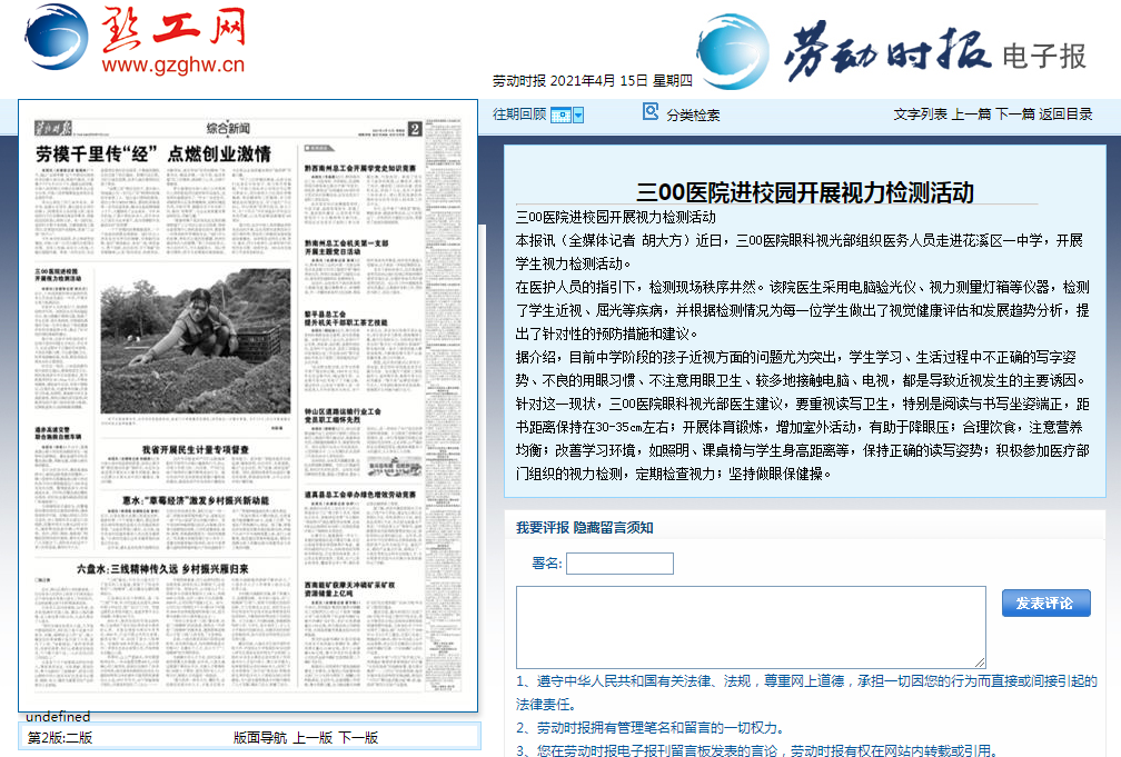 2021年4月15日《劳动时报》报纸报道:三〇〇医院进校园开展视力检查活动