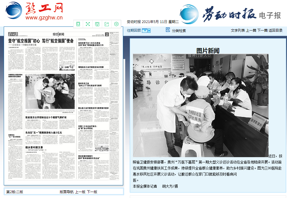 2021年5月11日《劳动时报》报纸报道:贵州“万医下基层”第一期大型义诊巡诊活动走进移民社区